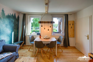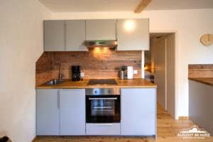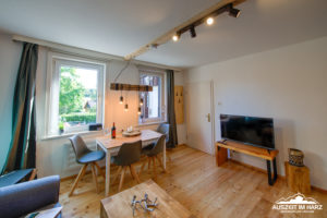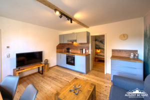 Frisch renovierte 3-Zimmer-Ferienwohnung mit Lärchen-Dielenboden auf ca. 40 m², große Wohnküche mit Backofen, Kochfeld, Kühlschrank mit Gefrierfach und Geschirrspüler. Ein Schlafzimmer mit Doppelbett, ein Schlafzimmer mit 2 Einzelbetten sowie ein gepflegtes Duschbad.