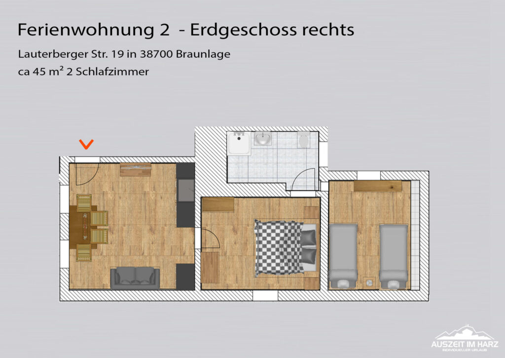 Bitte beachten Sie, dass der Durchgang vom Bad zum 2. Schlafzimmer (Ferienwohnung 2 und 4) baulich bedingt relativ schmal ist.
